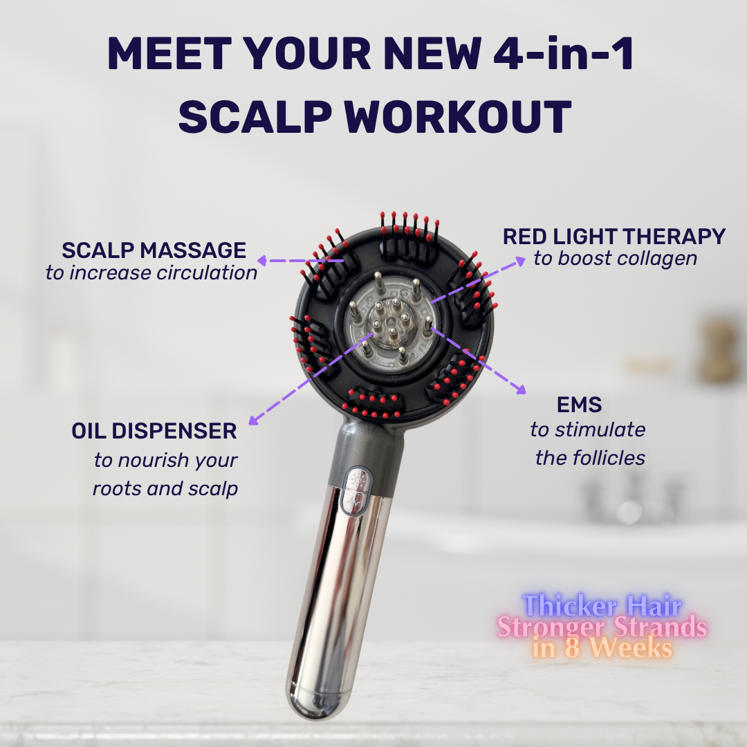 GRO: A premium 4-in-1 scalp therapy device designed to revitalize follicles, stimulate circulation, and strengthen roots through massaging, oiling, infrared light and EMS microcurrent