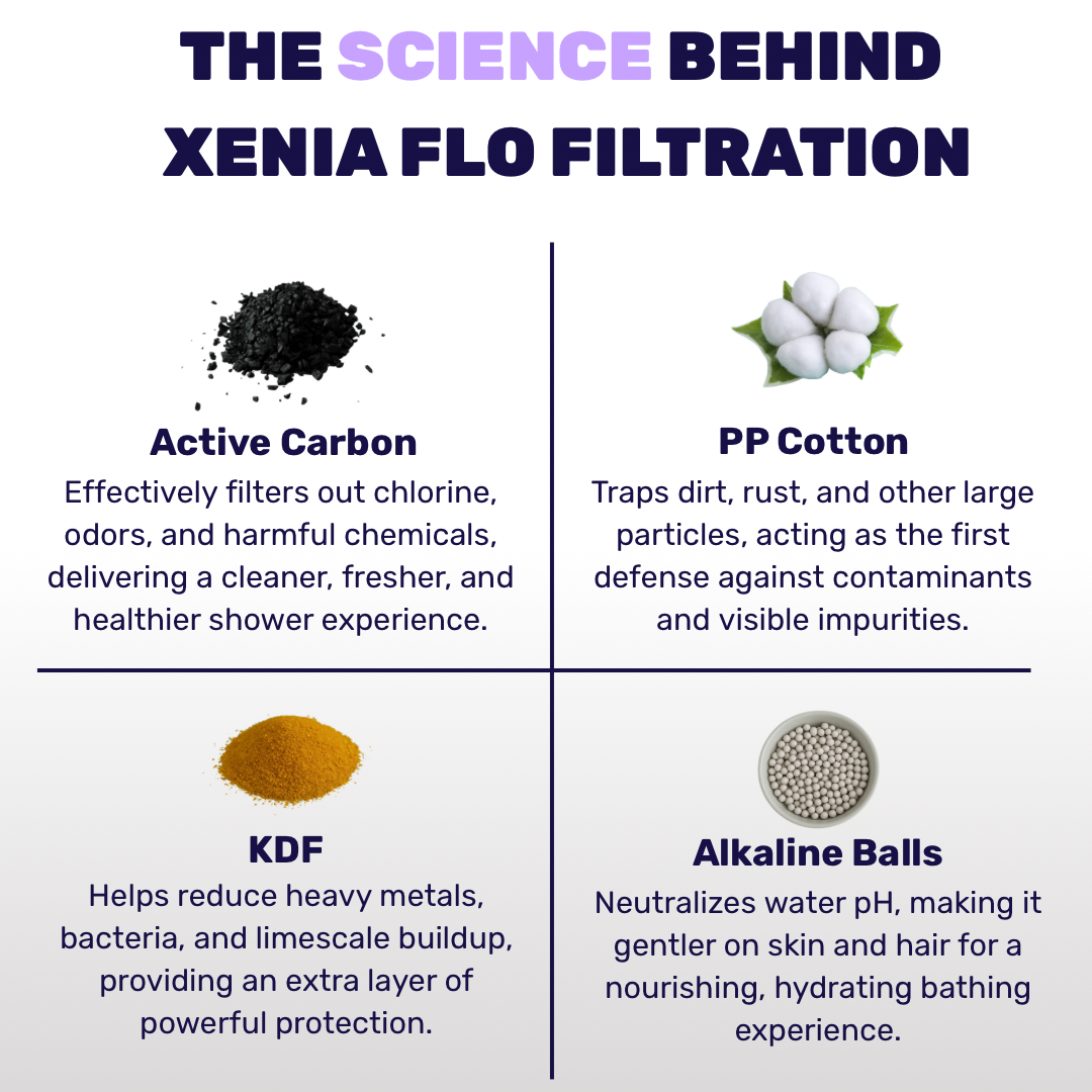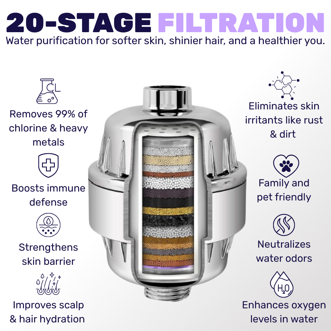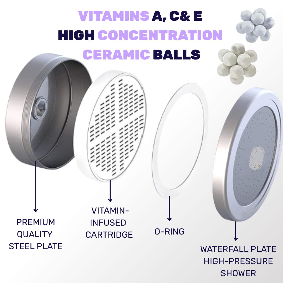 It features a 20-stage shower filter and alkaline balls infused with vitamins, both designed to remove chlorine, heavy metals, and other common tap water contaminants, turning hard water into a gentler, more luxurious shower experience.