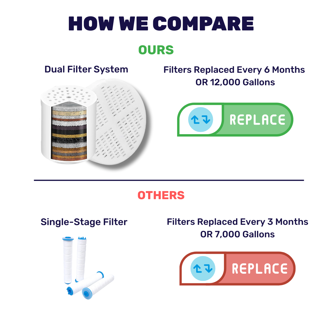 Each pack is built for long-lasting performance. Unlike standard filters that only last 3 months, our dual filtration system is designed to last 6 months or up to 12,000 gallons.